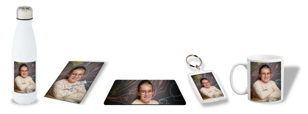 En plus des portraits individuels et des photos de groupe, je propose des produits personnalisés tels que des calendriers, marque-pages, cartes de vœux, mugs, tapis de souris, bouteilles isothermes, puzzles, et plein d’autres produits… Ces souvenirs sont parfaits pour les familles et les enseignants, et sont réalisés avec une attention particulière aux détails et à la qualité.